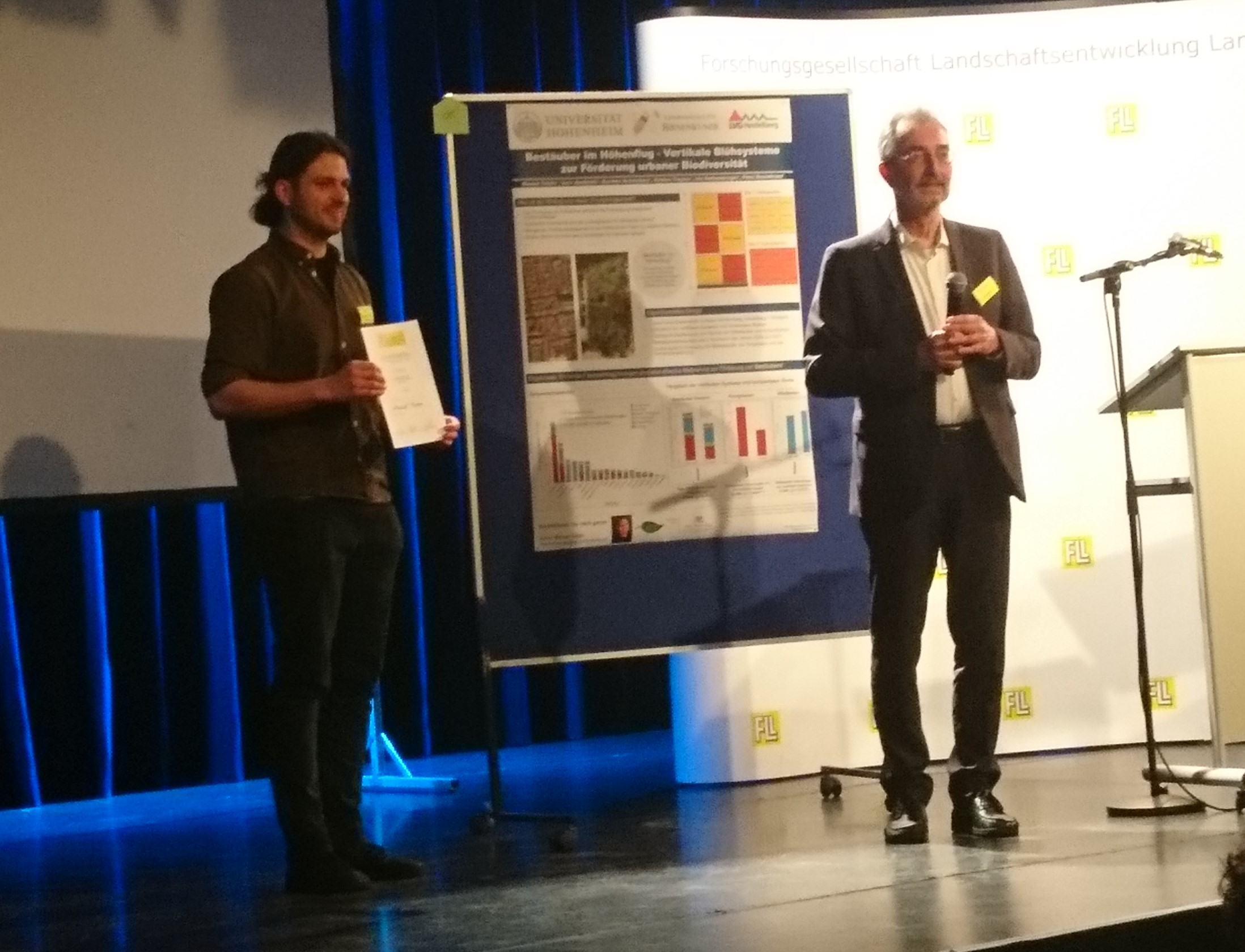 Beim 8. FLL Forschungsforum Landschaft 2023 in Berlin belegte unser Posterbeitrag Bestäuber im Höhenflug – Vertikale Blühsysteme zur Förderung urbaner Biodiversität den ersten Platz und wurde zusätzlich mit dem Publikumspreis ausgezeichnet. Herzlichen Dank an die FLL für diese Anerkennung und die tolle Tagung!