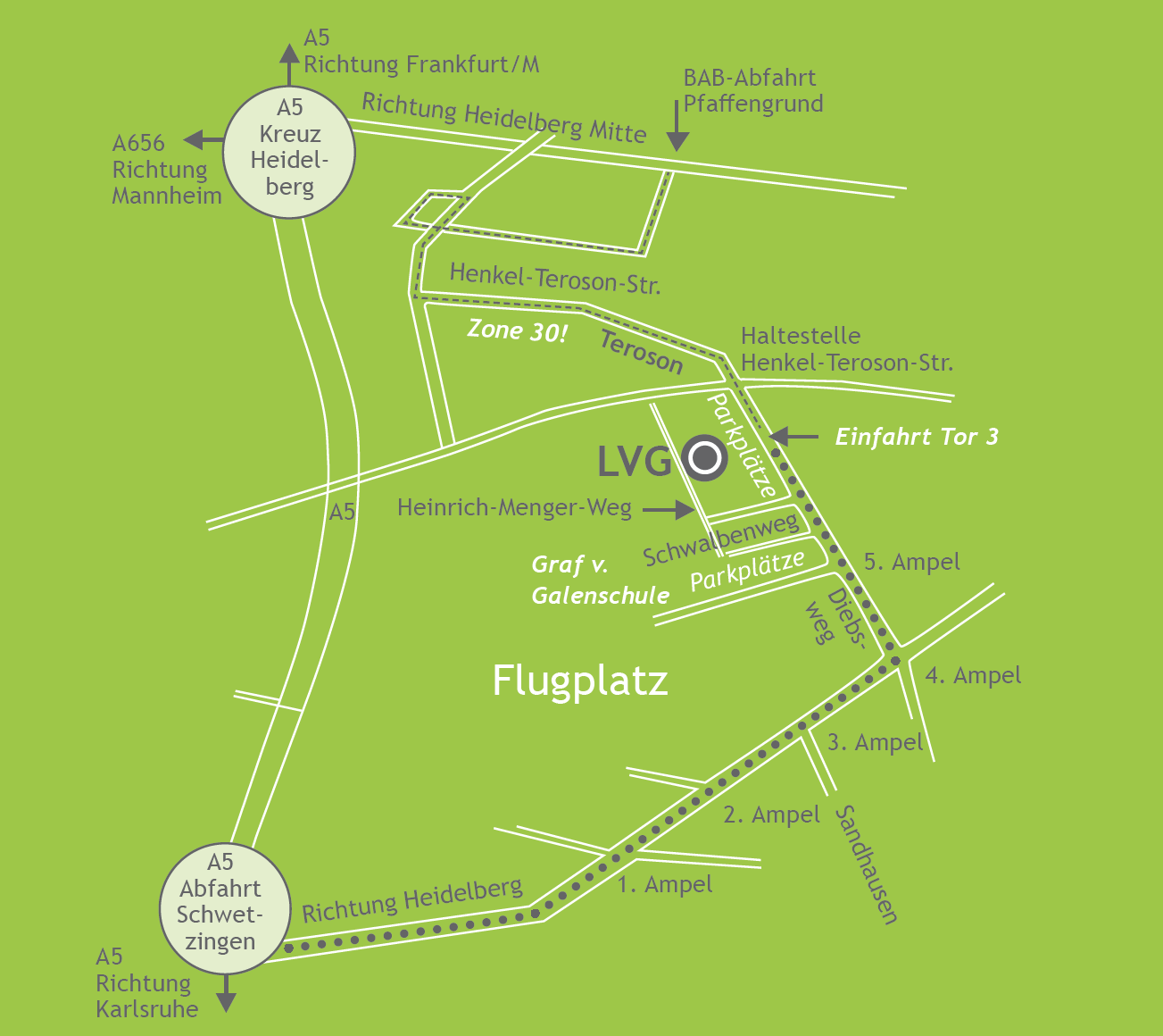 A5 > Abfahrt Schwetzingen > Richtung Heidelberg > 4. Ampel links > Richtung Flugplatz > LVG