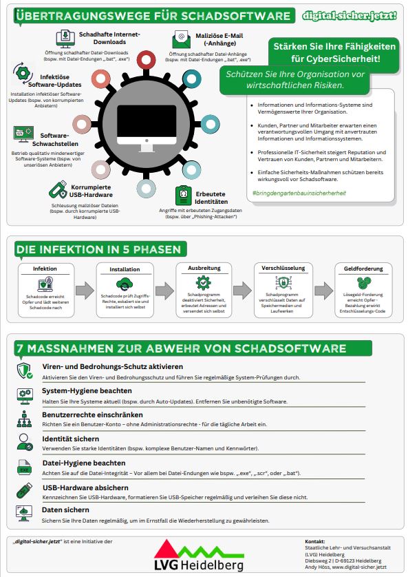 Schützen Sie Ihre Organisation vor CyberSicherheits-Risiken! Das Infogramm zeigt exemplarisch Übertragungswege, Infektion und Abwehrmaßnahmen von Schadsoftware. Es hilft Ihnen dabei, Ihre Organisation vor Hacker-Angriffen zu schützen und damit CyberSicherheits-Risiken zu reduzieren. Hierfür bieten wir regelmäßig Vorträge, Schulungen und Webinare im Rahmen unseres Studienangebots an. Download des Infogramms hier bzw. mehr unter www.digital-sicher.jetzt |